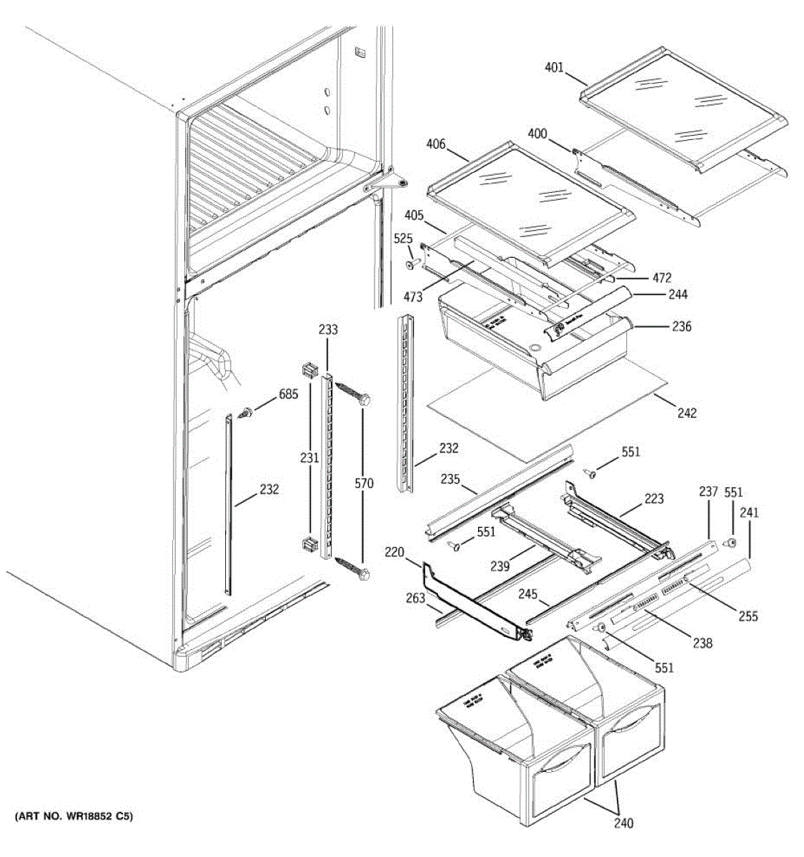 Cantilever side track for refrigerator shelves. Installs on interior wall to support sliding shelf mechanism. Replace if cracked, broken, or worn.