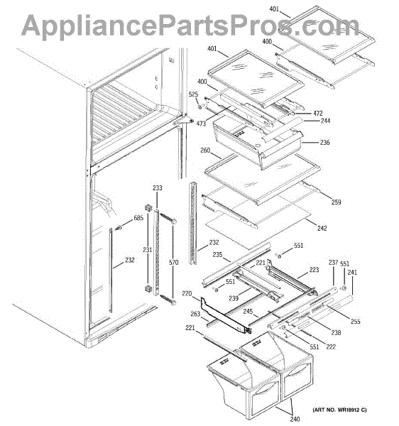 Rear rail for refrigerator vegetable pan drawer. Replaces broken, cracked, or missing rails. Mounts at the back of the crisper compartment for smooth sliding.