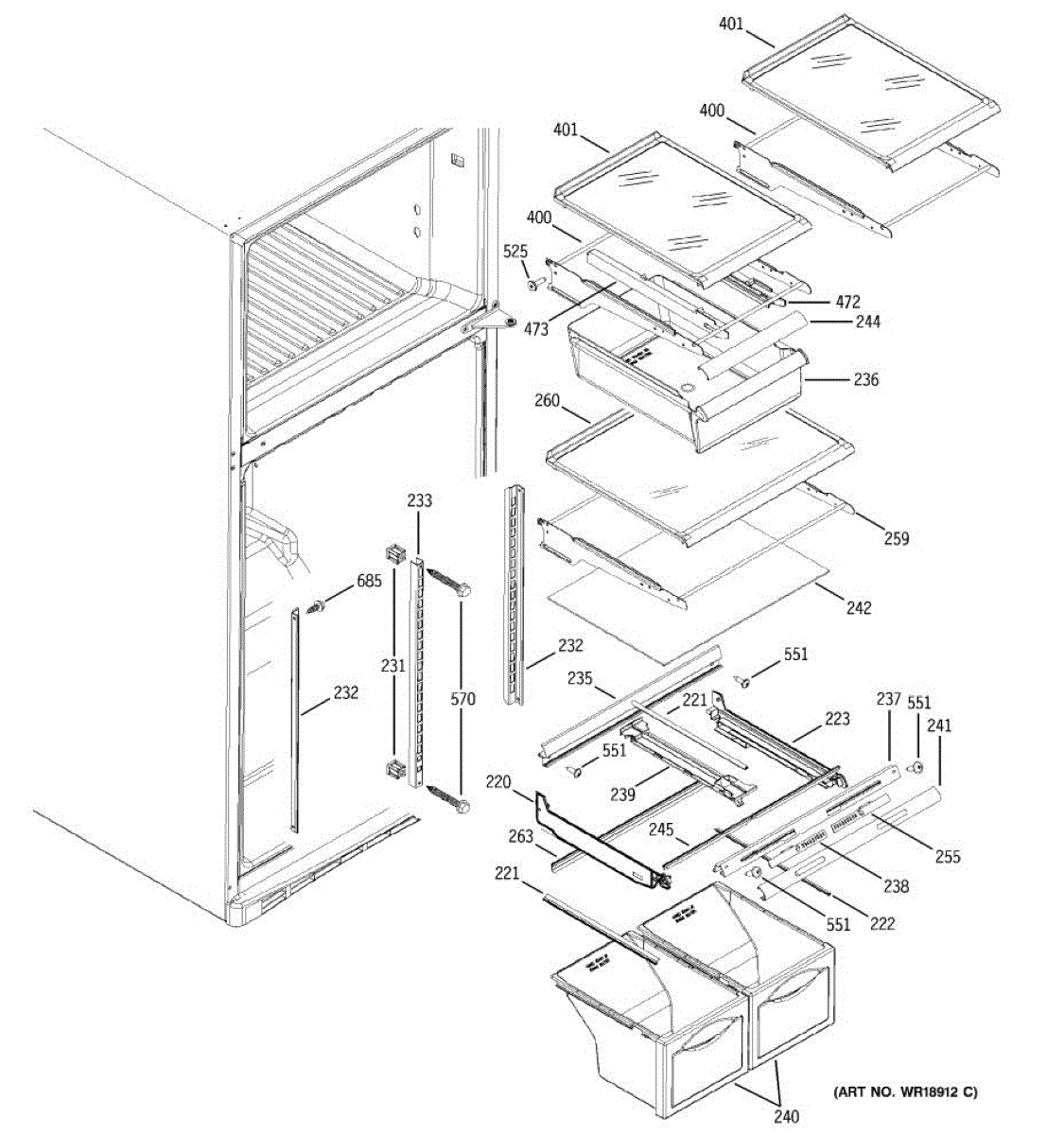 Cantilever side track for refrigerator shelves. Installs on interior wall to support sliding shelf mechanism. Replace if cracked, broken, or worn.