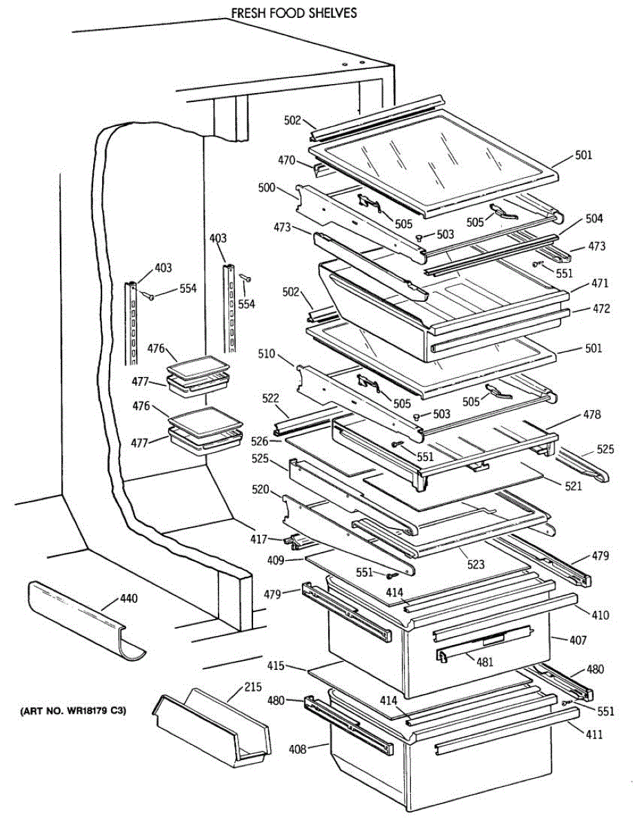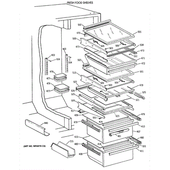 Cantilever shelf for side-by-side refrigerators. Replaces cracked, broken, or damaged shelving. Slides out for easy access to stored items.