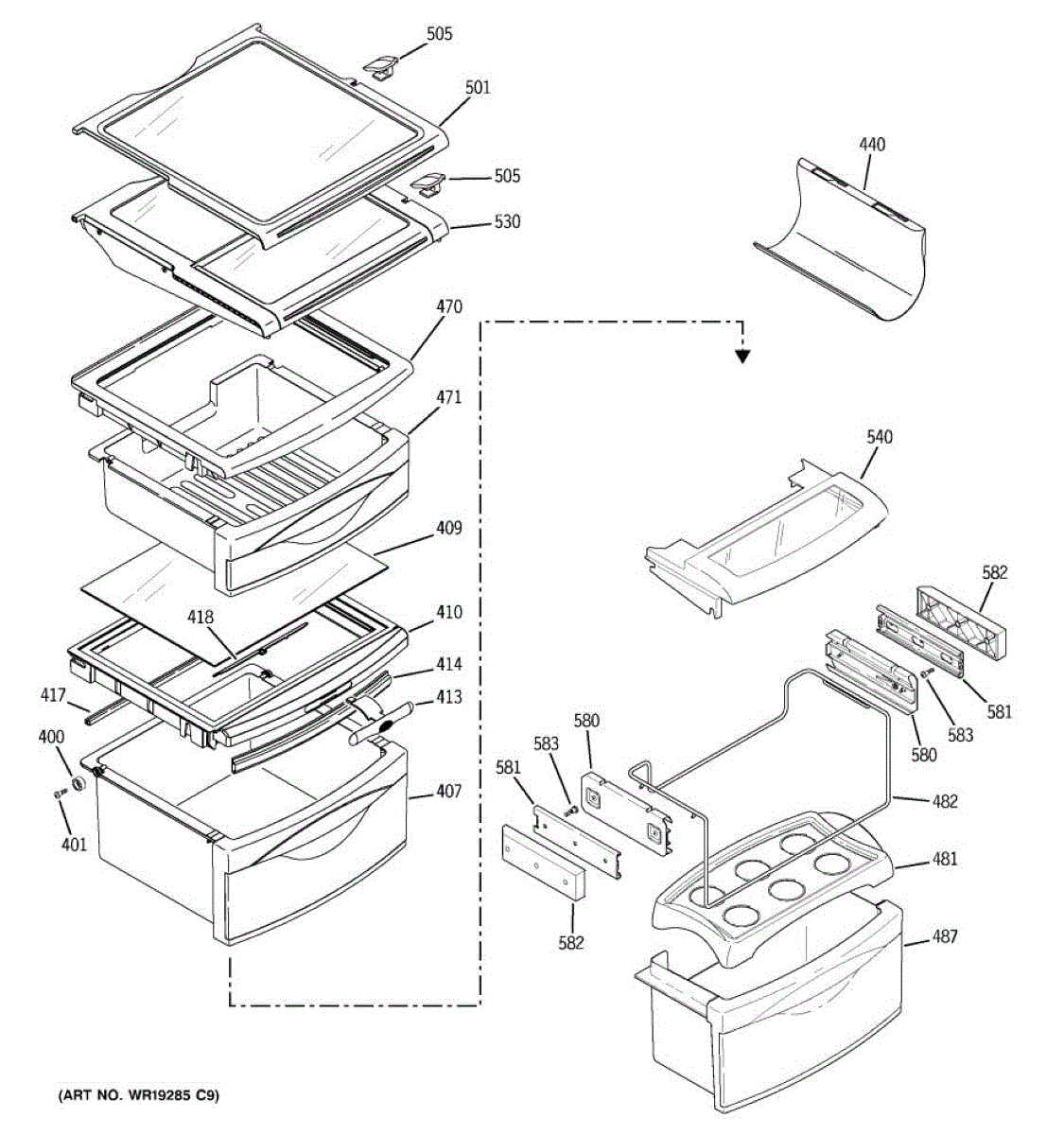 Replaces the sliding rail that allows refrigerator shelves to glide smoothly in and out. Needed when rails are cracked, broken, or no longer slide properly.