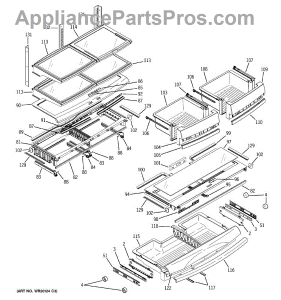 Tuckaway shelf assembly for refrigerator fresh food compartment. Replaces cracked, broken, or missing adjustable shelving. Installs on side rails.