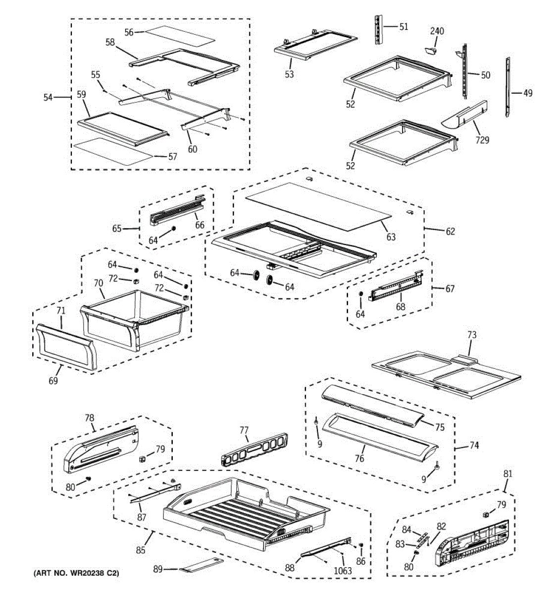Glass shelf assembly that covers the vegetable crisper drawer. Replacement needed when the glass cracks, shatters, or the plastic frame breaks or snaps.