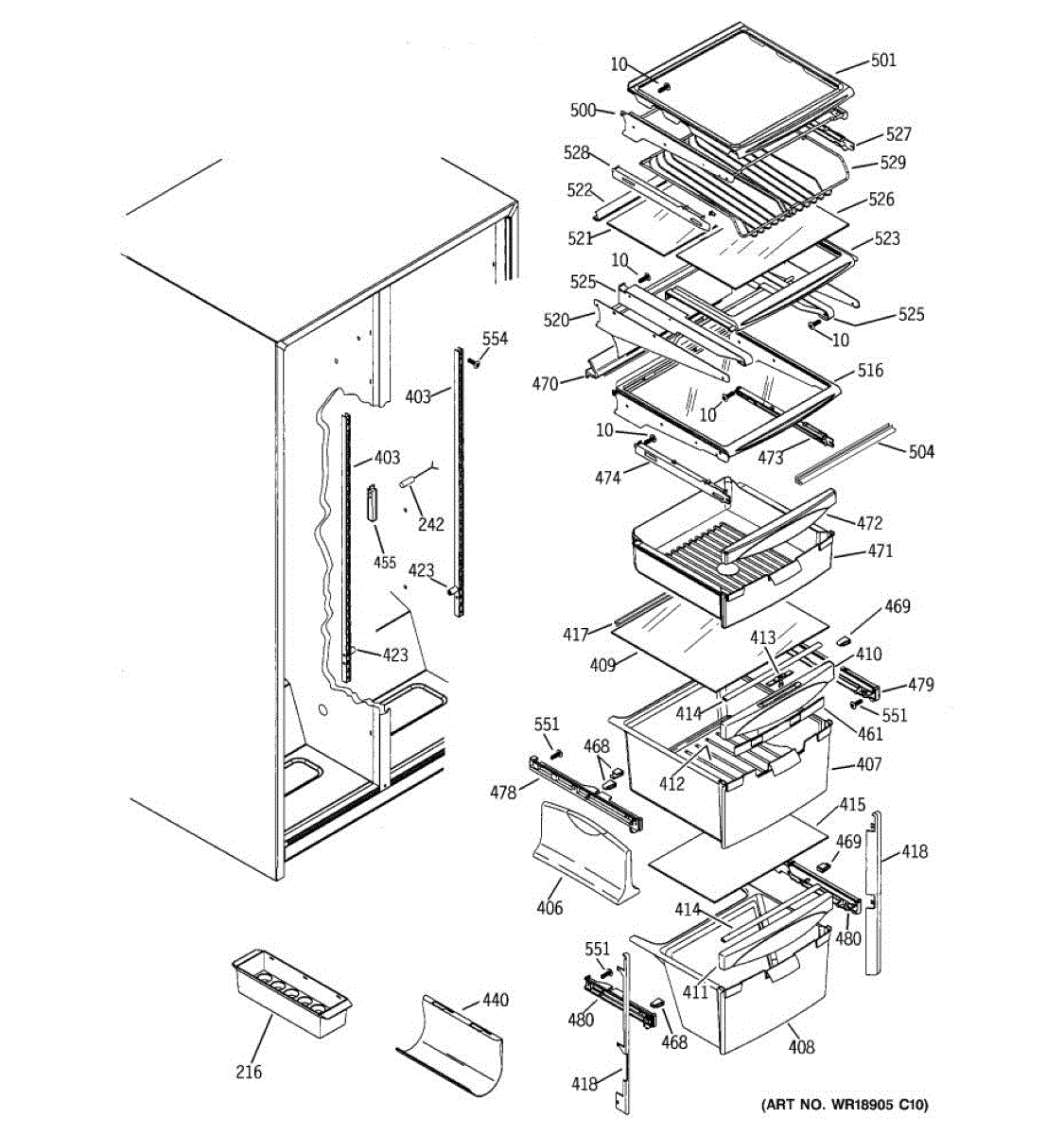 The Slide Assembly RH is an OEM replacement part for GE side-by-side refrigerators. As a replaceable sub-assembly, it restores smooth extension of plastic vegetable/multi-purpose slides on the right interior. The slide measures approximately 16 inches.