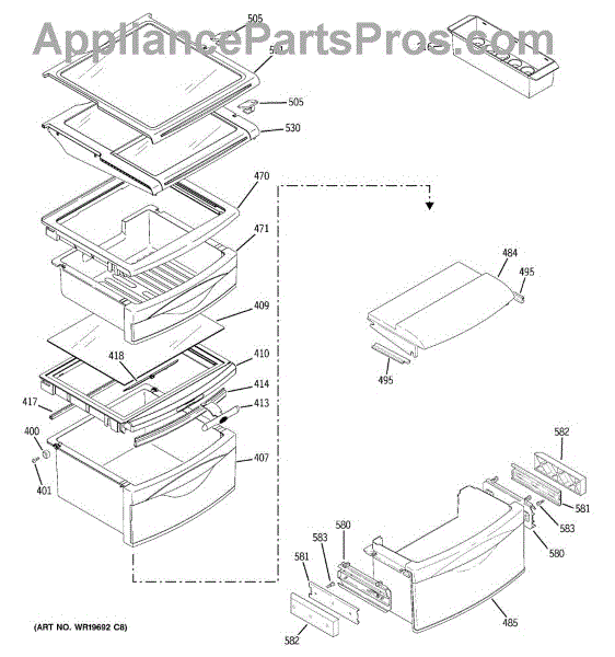 The Shelf Stop is an OEM replacement part for GE refrigerators. The shelf stop in your refrigerator is what locks the shelf into the refrigerator liner.The shelf stop features a small protruding nub that fits into pre-cut slots in shelf supports, preventing shelves from being inserted too far. Causes of a bad shelf stop can include wear over many years of shelf adjustment, or damage from impact with shelves. Symptoms of a bad shelf stop include:
