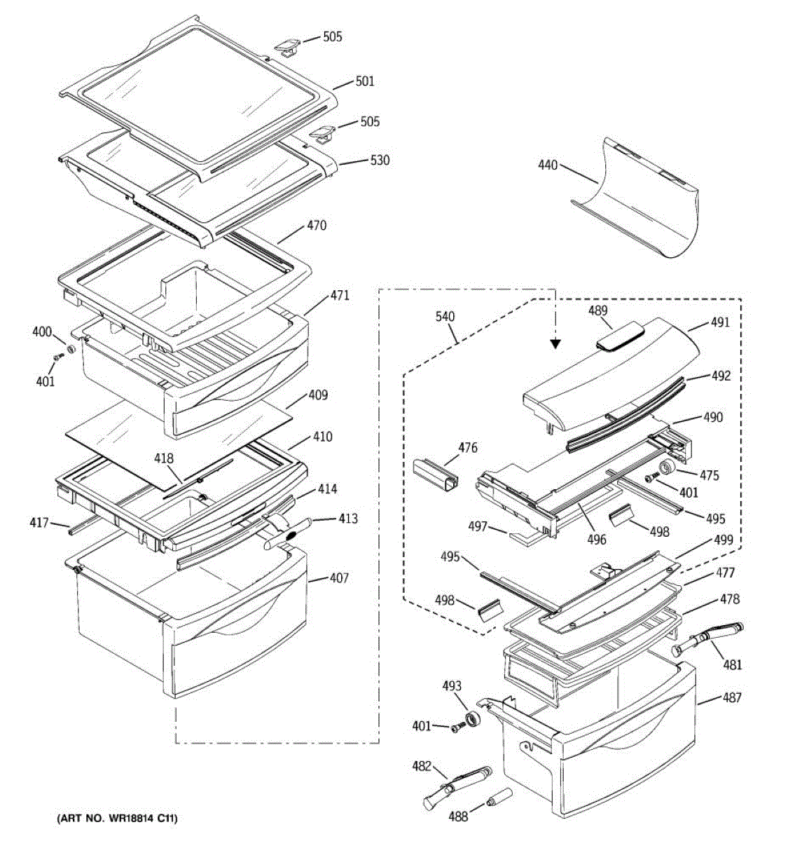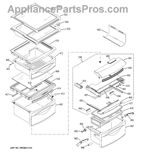 This shelf slideout assembly replaces a worn or broken slide mechanism so a refrigerator shelf glides smoothly in and out for easier access and safer storage. Fits the factory shelf track to restore normal shelf movement. What it does: