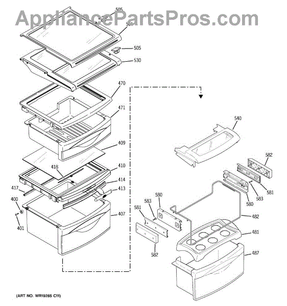 Replacement slide-out shelf for refrigerator interior storage. Installs in main compartment. Replace if cracked, broken, or warped. Slides for access.