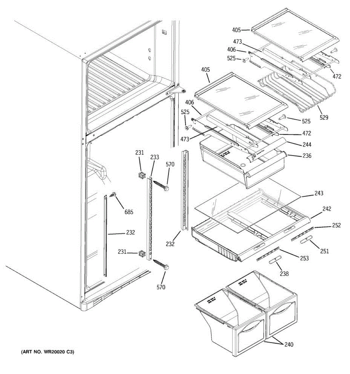 Supportive shelf frame that covers and seals the crisper drawer area. Replace if cracked, broken, or warped to restore proper drawer support and organization.