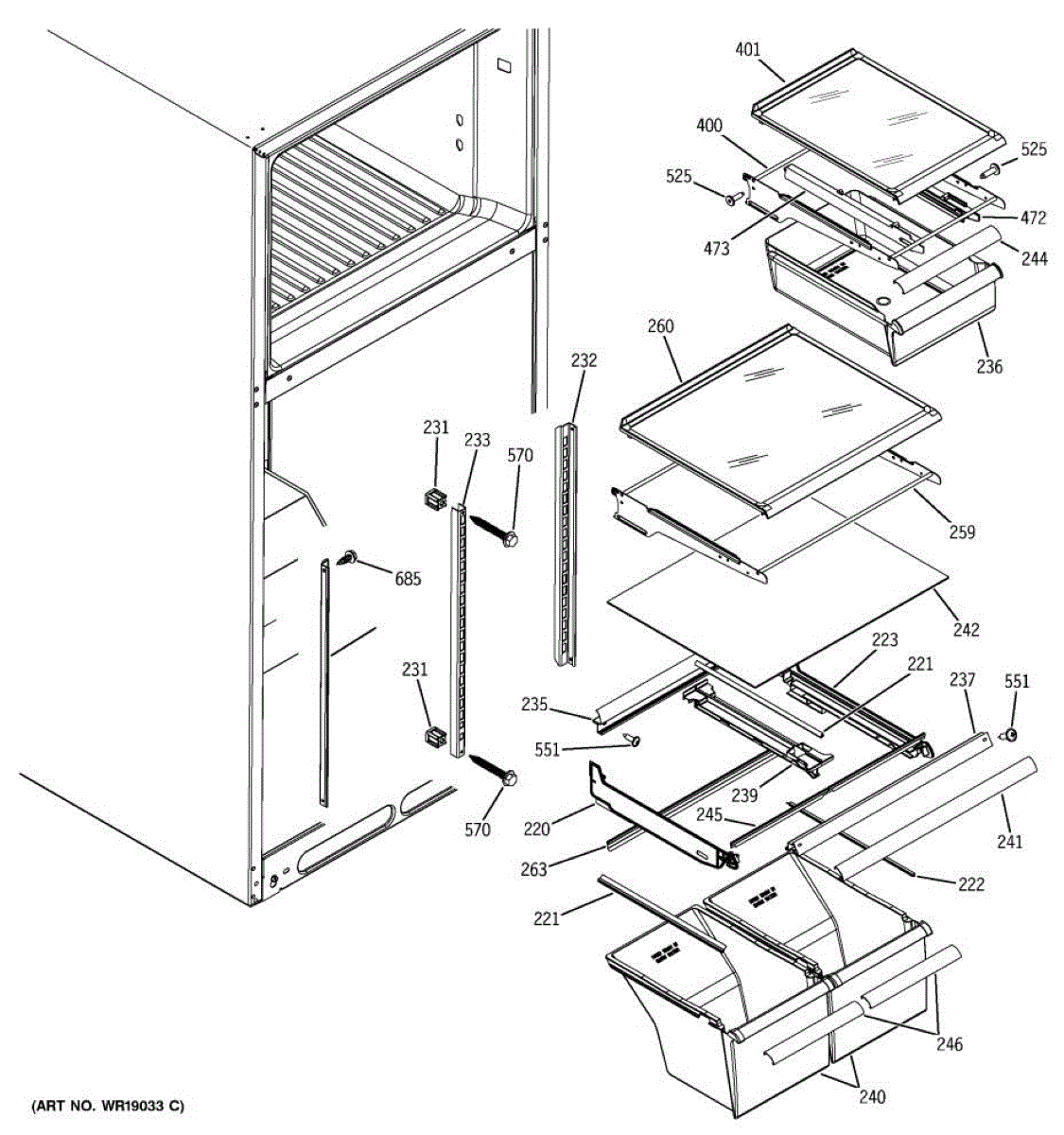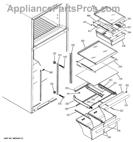 Cantilever side track for refrigerator shelves. Installs on interior wall to support sliding shelf mechanism. Replace if cracked, broken, or worn.