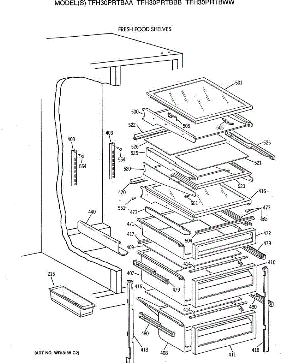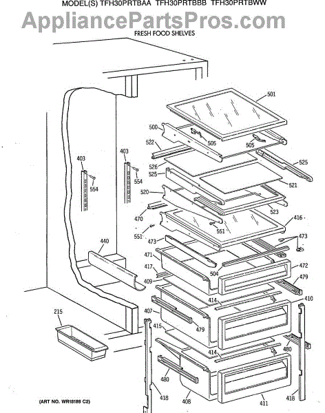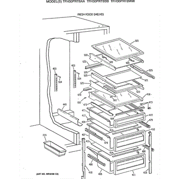Cantilever shelf for side-by-side refrigerators. Replaces cracked, broken, or damaged shelving. Slides out for easy access to stored items.