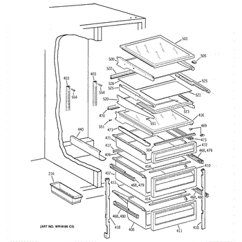 Cantilever shelf for side-by-side refrigerators. Replaces cracked, broken, or damaged shelving. Slides out for easy access to stored items.