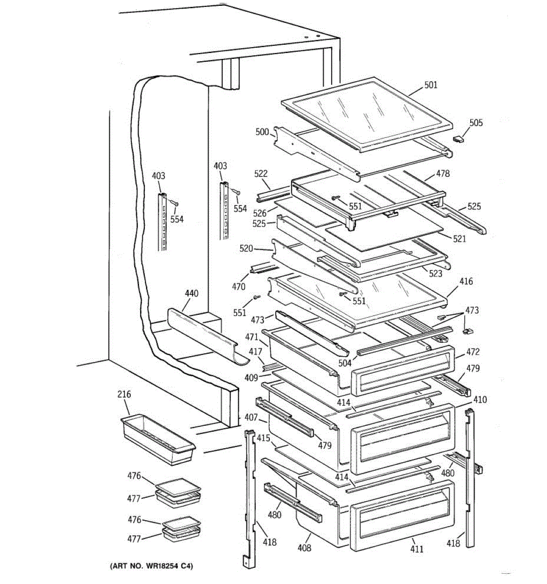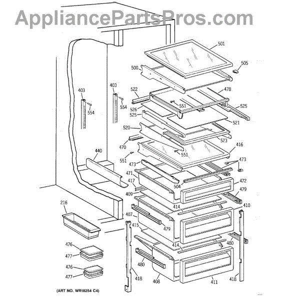 Cantilever shelf for side-by-side refrigerators. Replaces cracked, broken, or damaged shelving. Slides out for easy access to stored items.