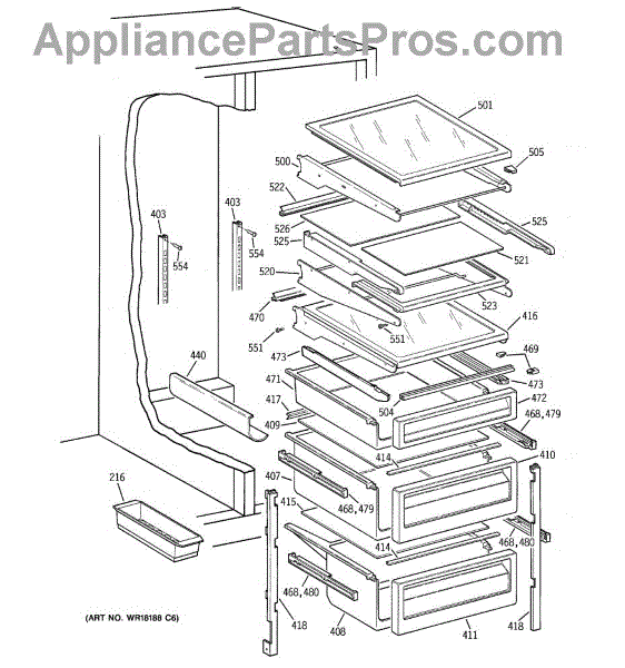Cantilever shelf track for refrigerators. Mounts to the interior wall to support adjustable shelving. Replace if cracked, broken, or damaged.