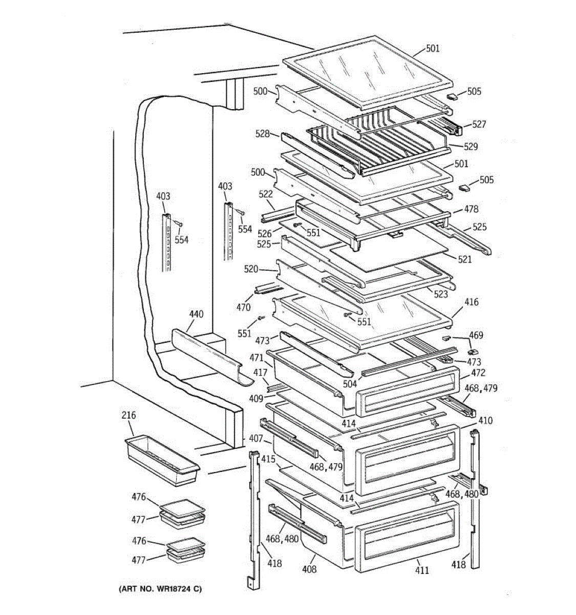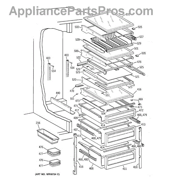 Replacement shelf end cap slide rail for refrigerator shelves. Installs on shelf edge to guide smooth sliding. Needed when original is cracked or broken.