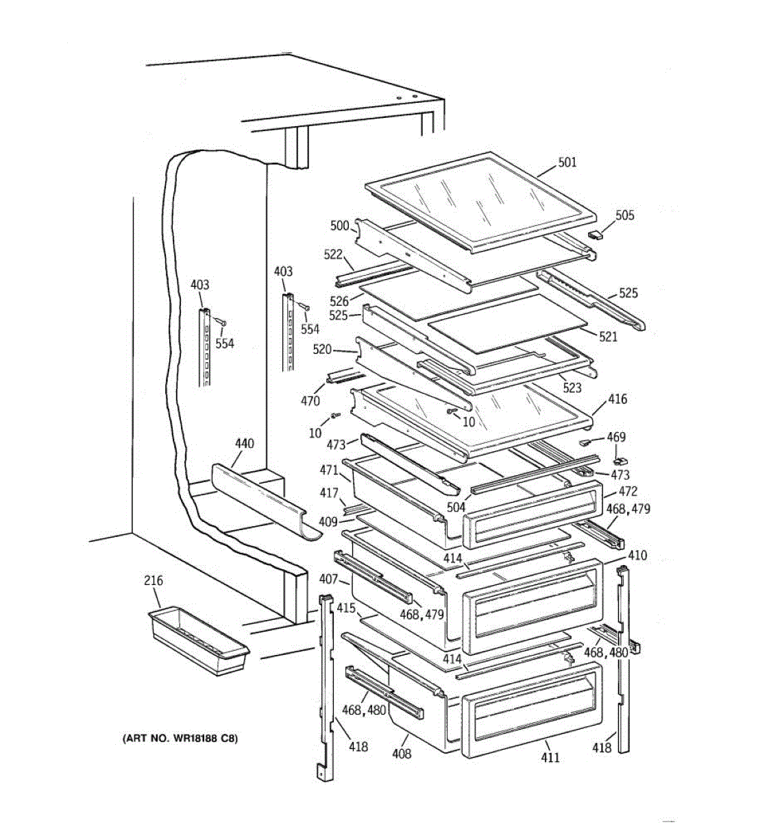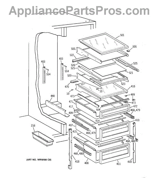 Right-hand drawer slide assembly for refrigerator crisper and meat pan drawers. Replace if cracked, broken, or causing drawers to sag or drop.