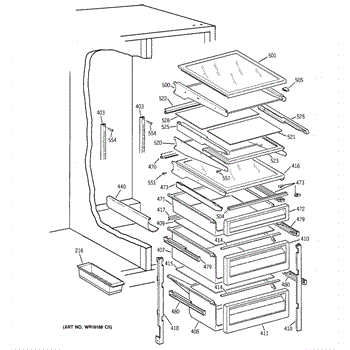 Right-hand drawer slide assembly for refrigerator crisper and meat pan drawers. Replace if cracked, broken, or causing drawers to sag or drop.