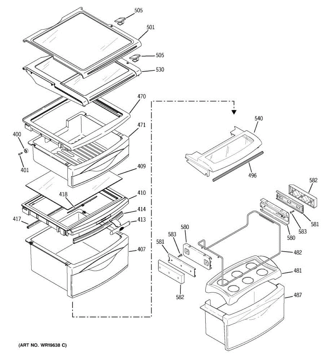 The Fruit and Vegetable Pan Shelf is an OEM part for GE refrigerators. Designed to provide sturdy support and optimal storage for fruit and vegetable pans, this shelf is an essential component for organizing and accessing your produce with ease. It fits snugly above the fruit and vegetable drawers, maximizing space utilization within the fridge and helping maintain the freshness of fruits and vegetables by ensuring proper air circulation around them.