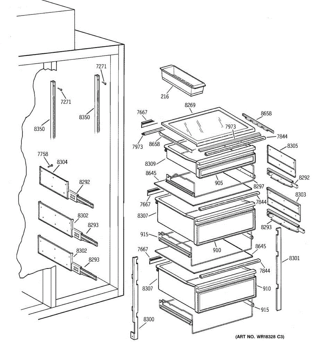 Right-side slide track for refrigerator pull-out shelves. Replace this support rail if cracked, broken, or no longer gliding smoothly. Installs inside.