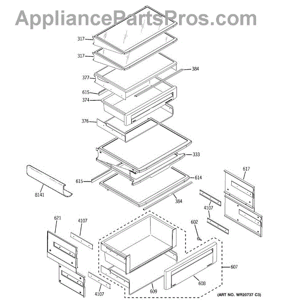 This outer drawer slide supports and guides a refrigerator drawer or pantry pan so it opens and closes smoothly. Replacing a worn or cracked slide restores alignment and helps prevent sticking, tipping, or spills.
