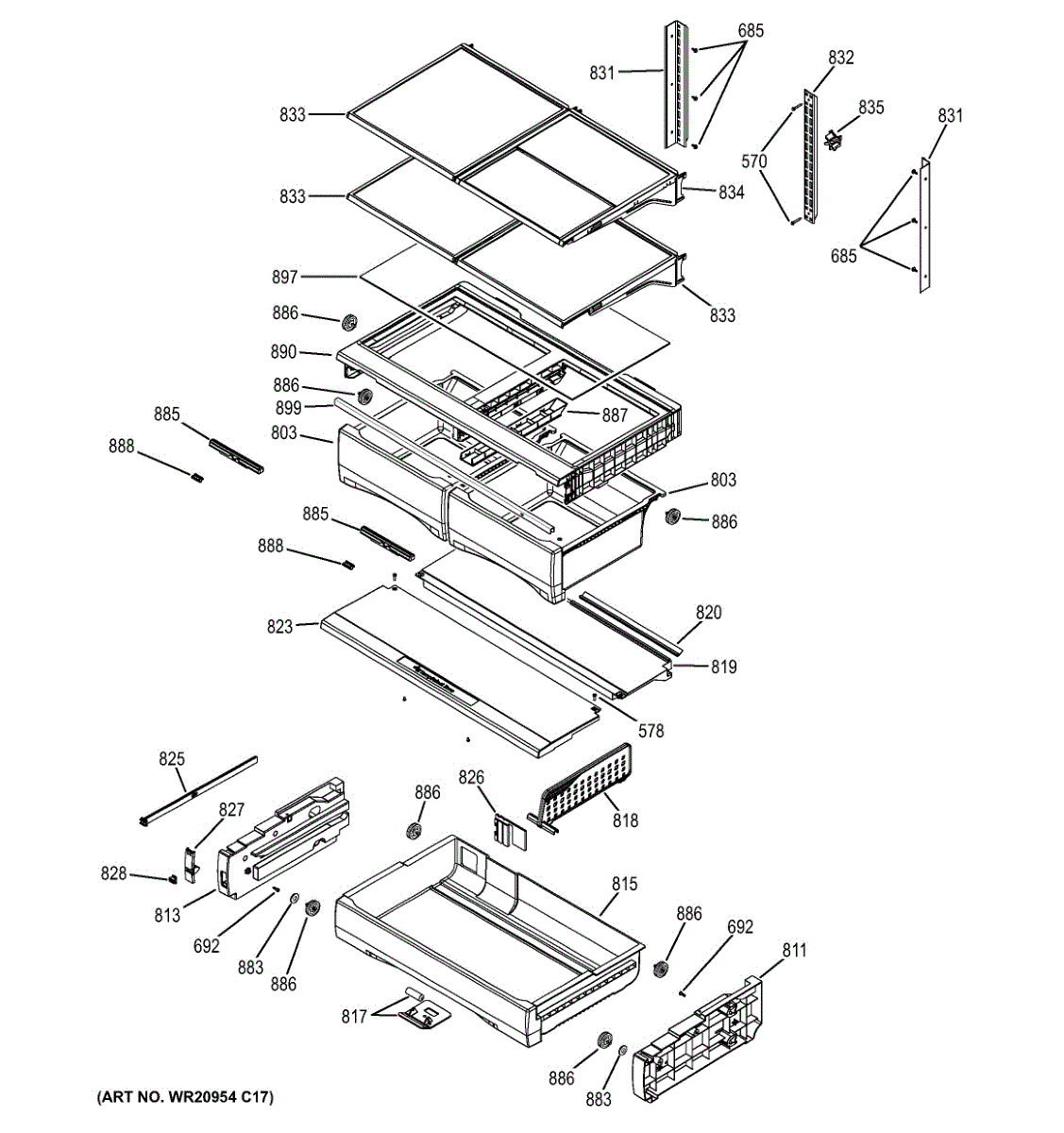 Guides and supports fresh food door drawer for smooth sliding and proper alignment. Replace if drawer sticks, wobbles, or doesn't close properly.