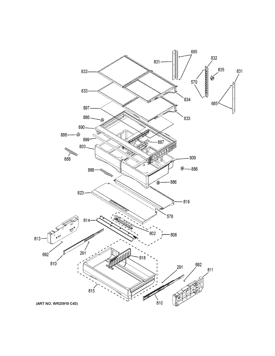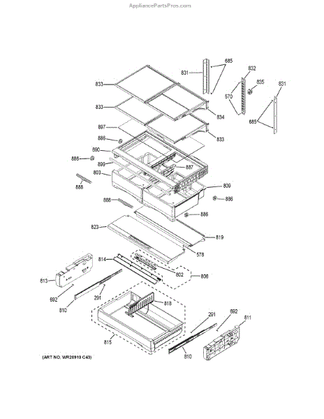 The Shelf Assembly is an OEM component for GE side-by-side refrigerators. Adjustable and positioned on tracks inside fresh food cabinets, it provides flexible storage organization. Reliable shelving depends on a functioning assembly.