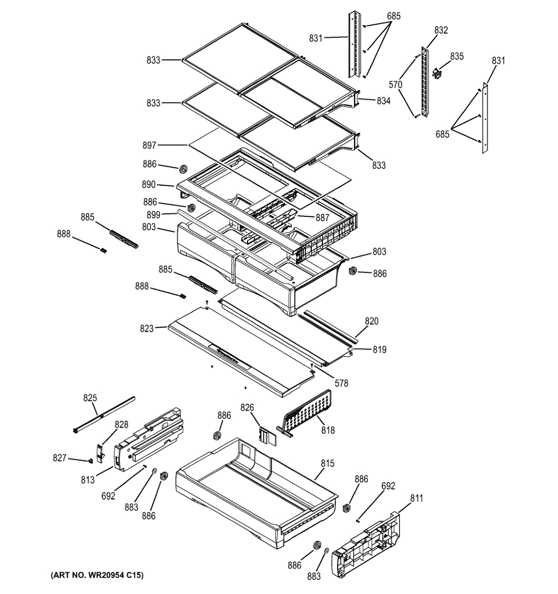 Guides and supports fresh food door drawer for smooth sliding and proper alignment. Replace if drawer sticks, wobbles, or doesn't close properly.