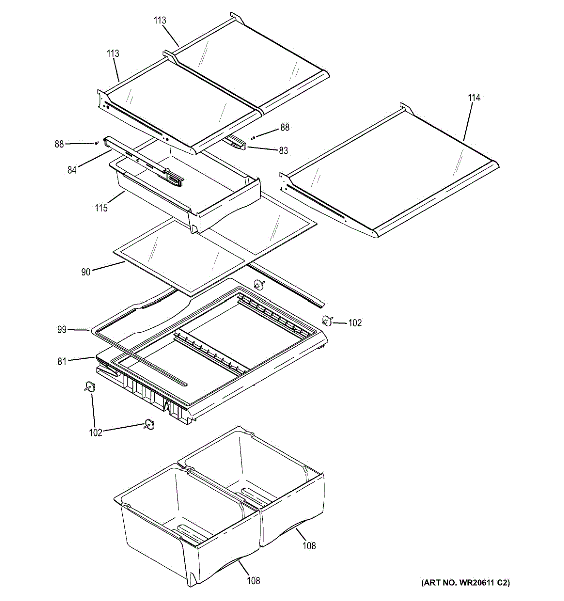 This is the clear glass that sits atop the crisper/vegetable drawers, creating a sturdy shelf and sealing the bins to help maintain proper humidity. Replacing damaged glass restores a flat, clean surface for food storage.
