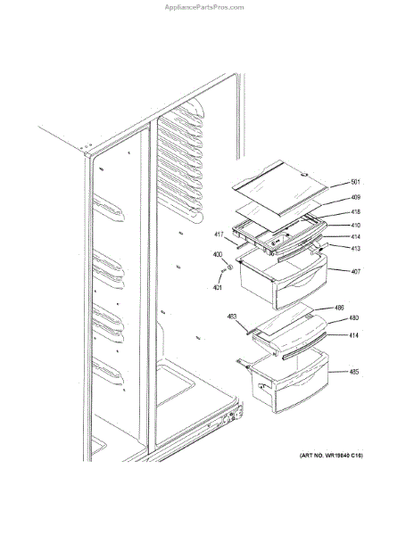 The Drawer Cover is an OEM replacement part for select GE refrigerator vegetable and deli drawers. It protects stored contents from dehydration, contaminants and prolonged illumination while keeping the drawers light-sealed. Proper drawer insulation optimizes food storage conditions. Causes of a bad drawer cover can include cracks and breaks from repeated drawer opening/closing stresses over time. Exposure to produce acids and moisture accelerates degradation of plastic sealing surfaces. Symptoms include: