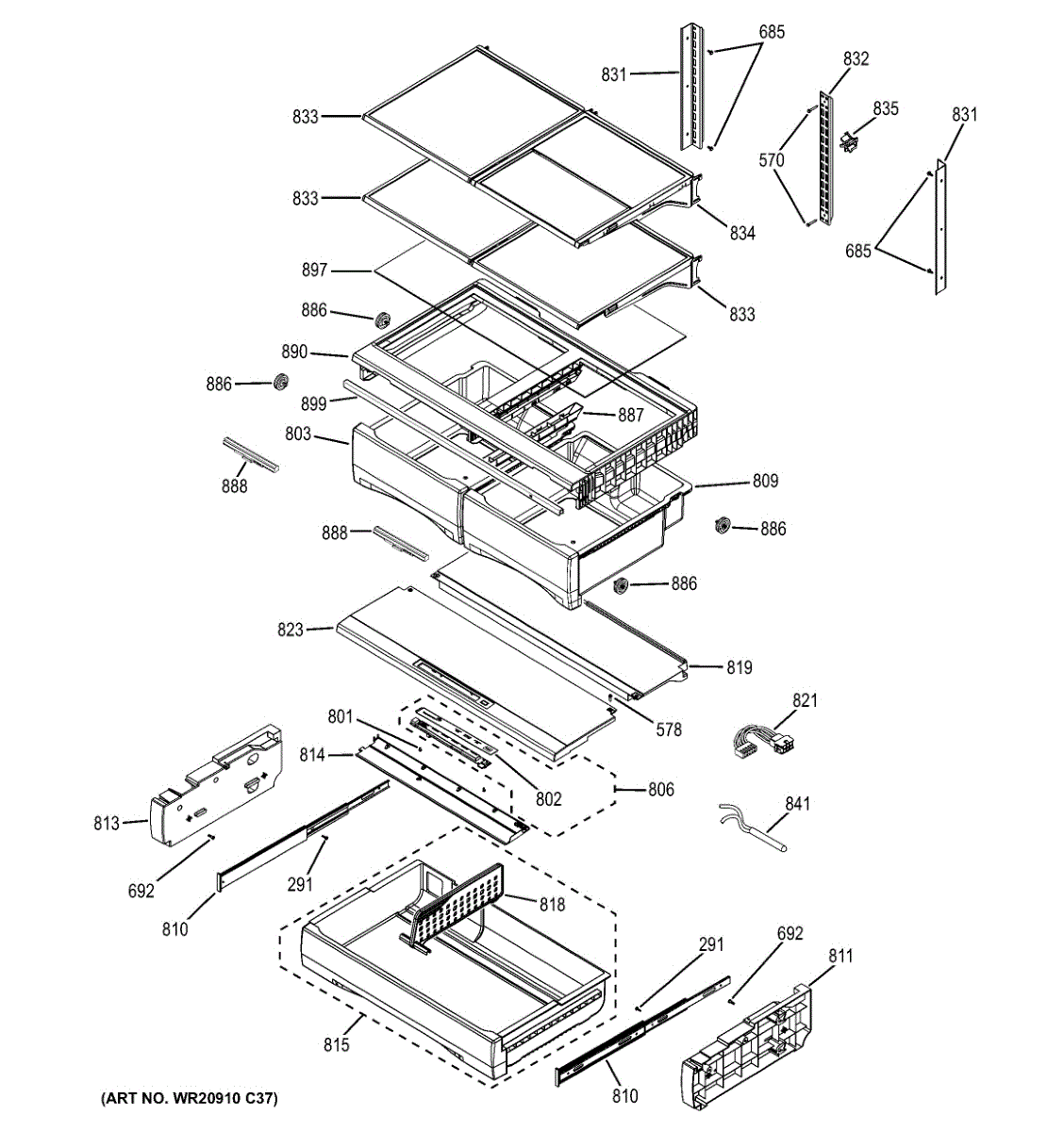 Adjustable shelf assembly for refrigerator fresh food compartment. Replace if cracked, broken, or missing to restore flexible storage organization.