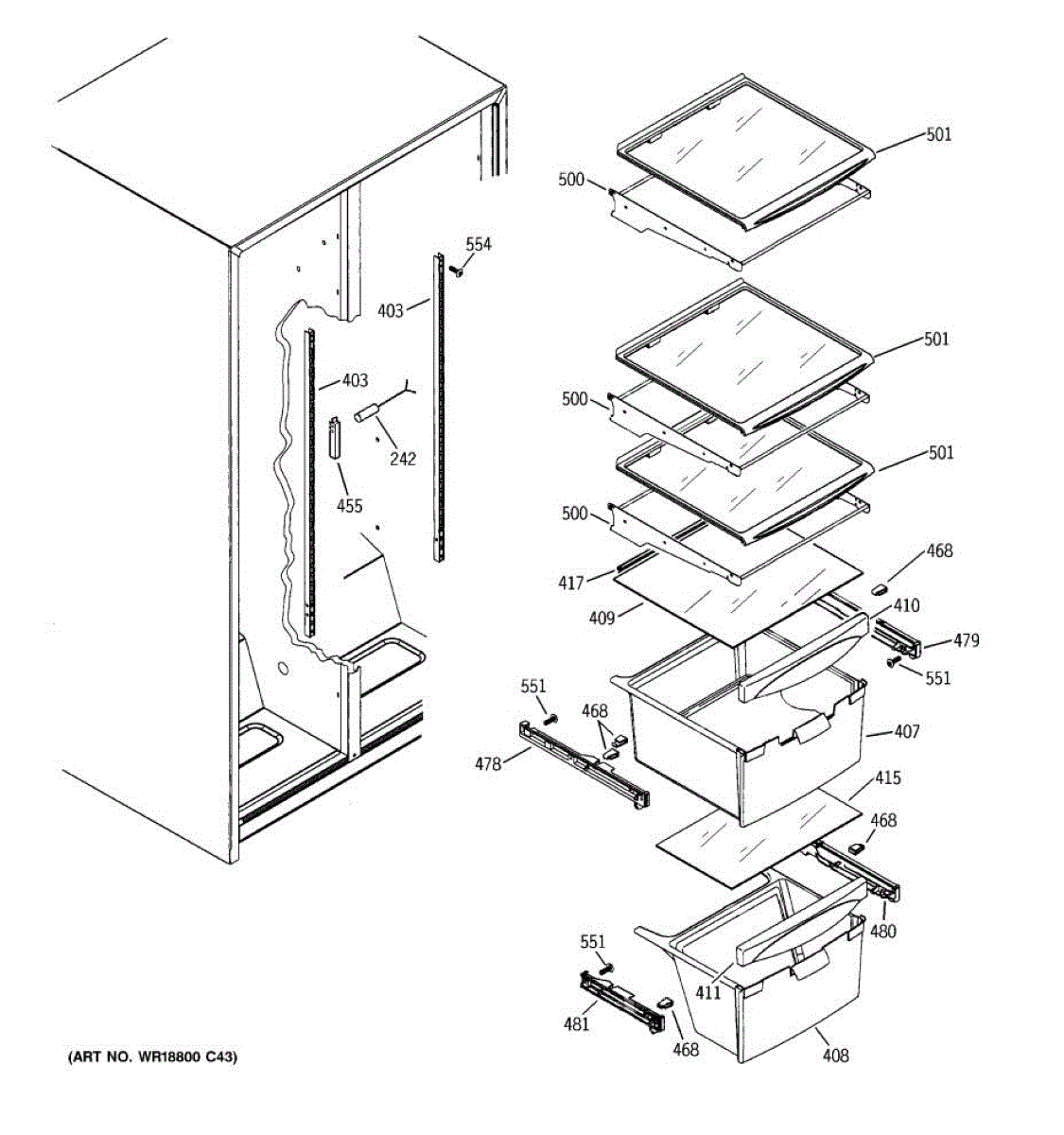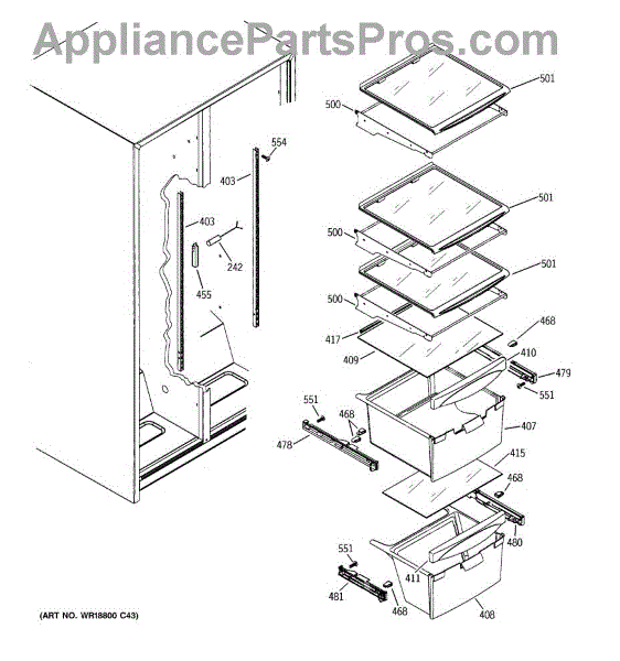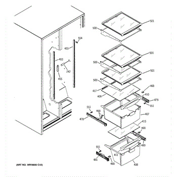 Cantilever shelf track for refrigerators. Mounts to the interior wall to support adjustable shelving. Replace if cracked, broken, or damaged.