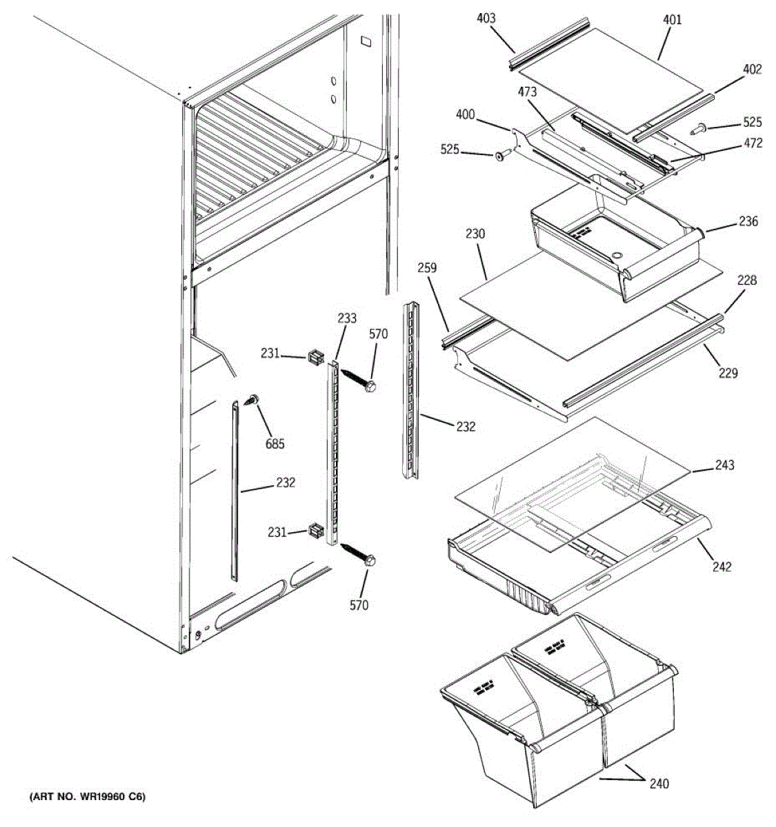 Cantilever side track for refrigerator shelves. Installs on interior wall to support sliding shelf mechanism. Replace if cracked, broken, or worn.