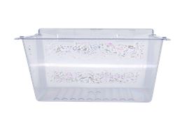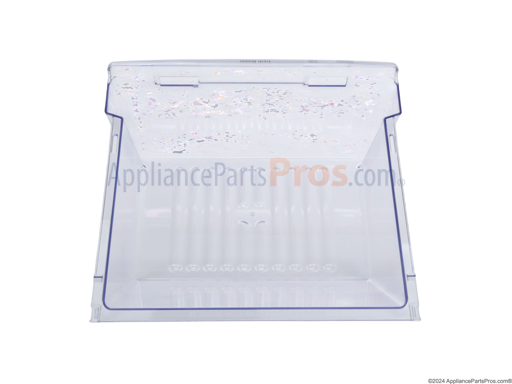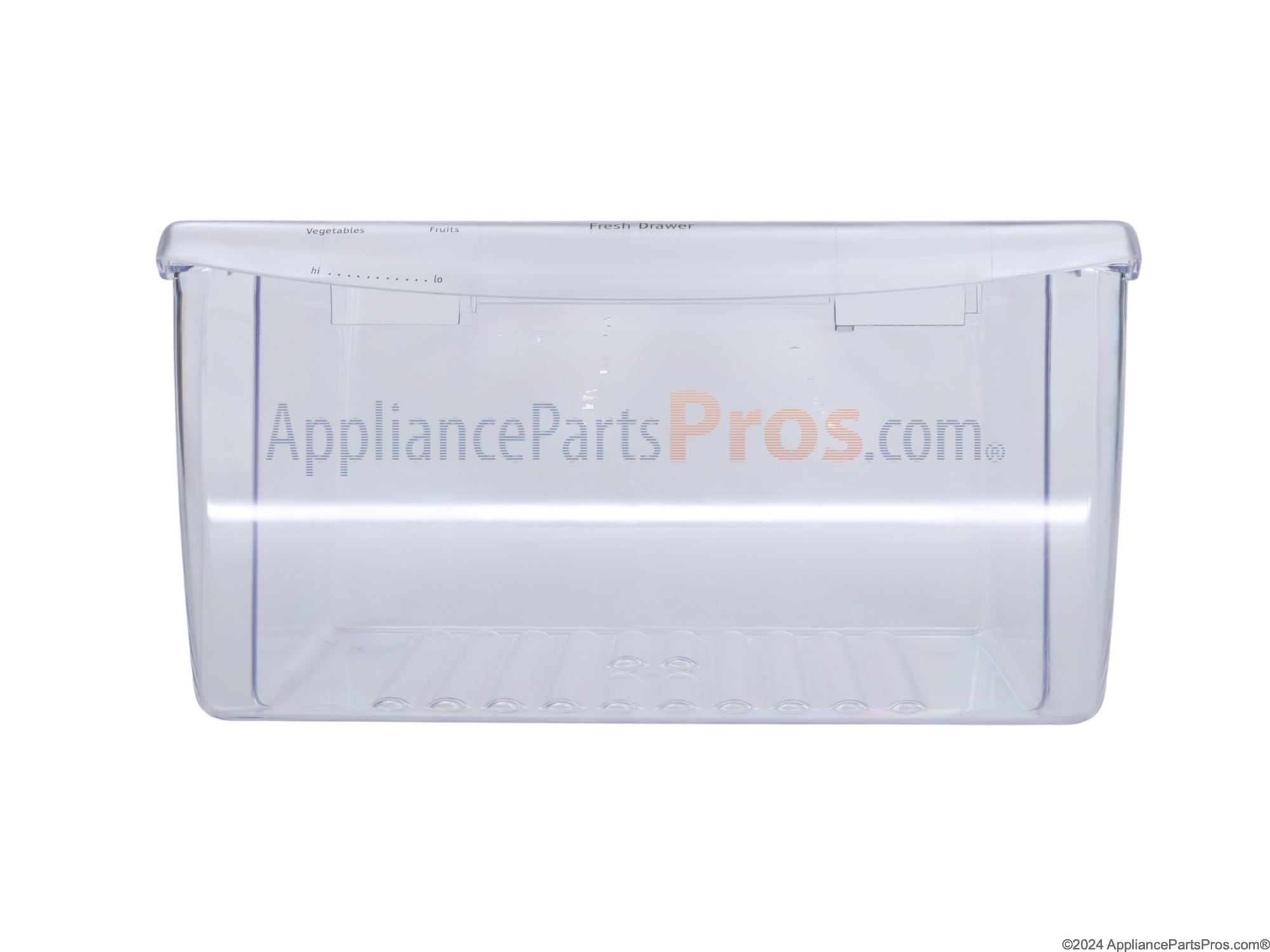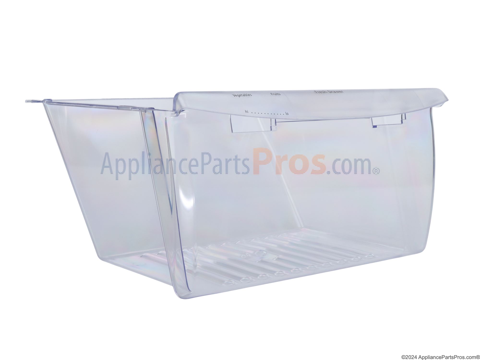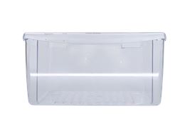 The Crisper Pan is an OEM part for Frigidaire refrigerators. This pan is designed to store fruits and vegetables at an optimal humidity level, helping to keep them fresh for longer periods. It slides easily in and out of the refrigerator compartment, allowing for convenient access and organization of produce. The drawer measures approximately 15 inches in width and extends about 16 inches from front to back. Please note that due to a factory revision, the new version of this crisper drawer does not feature a humidity control slide.