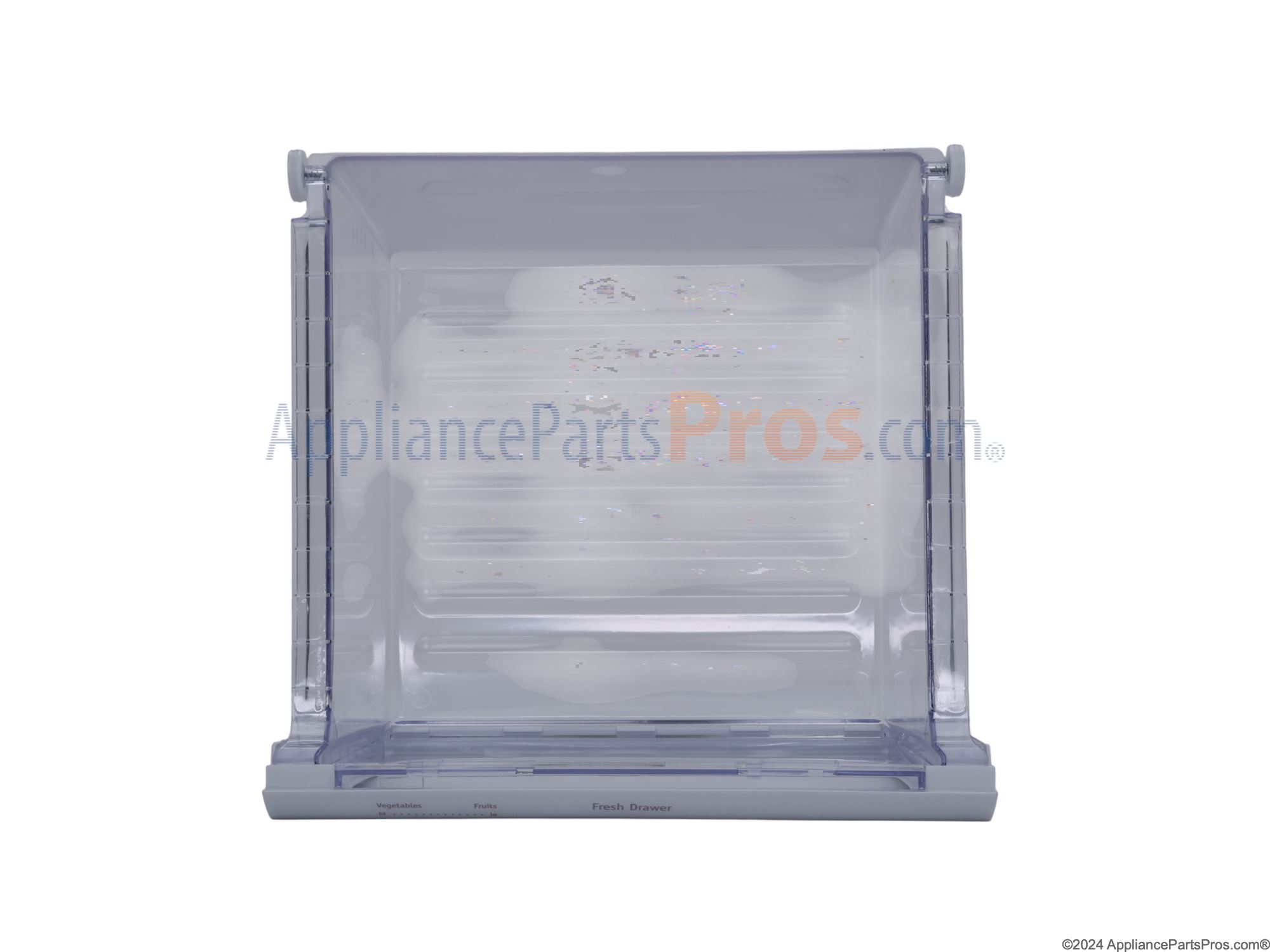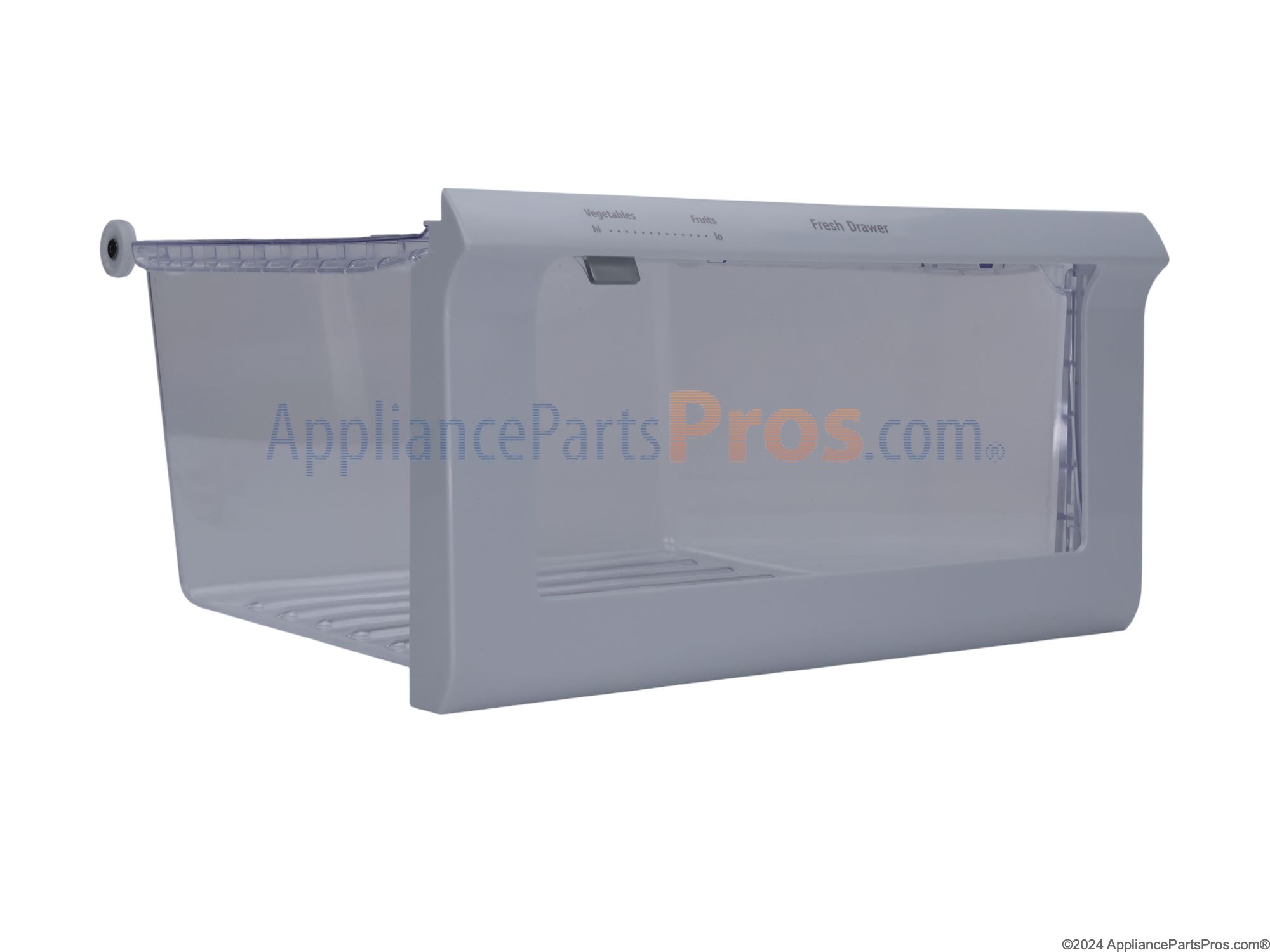 The Crisper Pan Drawer is an OEM replacement part for Frigidaire refrigerators. It is located inside the fridge interior and provides a fully enclosed storage space with higher relative humidity levels than the surrounding fridge areas. This helps keep fruits and vegetables fresher for longer by reducing moisture loss. Causes of a bad crisper drawer can include wear and tear of sliding drawer parts over time, damage to humidity venting components, or warping/cracking of the plastic crisper material itself. Symptoms of a bad crisper drawer include: