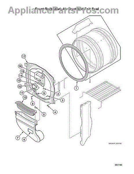 Seals the gap between drum and bulkhead to reduce air leaks, prevent lint buildup, and quiet operation. Replace if torn or worn. Adhesive required.