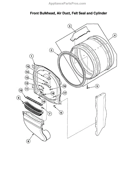 This front bulkhead assembly forms the dryer's front drum support and air seal. Replacing a worn or damaged bulkhead restores smooth drum rotation, reduces noise, and helps maintain proper airflow for consistent drying performance.