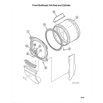 This front bulkhead assembly forms the dryer's front drum support and air seal. Replacing a worn or damaged bulkhead restores smooth drum rotation, reduces noise, and helps maintain proper airflow for consistent drying performance.