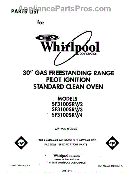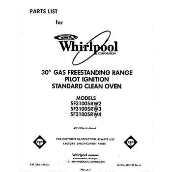 Parts for Whirlpool SF3100SRW3: Front Cover Parts