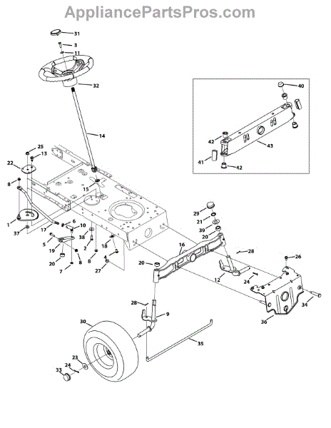 This is a front steering gear assembly that is used in the construction of many models of lawnmowers. It is made of metal and links the drag links with the steering shaft pinion. This creates the ability for the drag links to turn the front wheels when a user turns the steering shaft. The front steering gear is an integral part of the steering assembly and any damage to the component will require replacing it.If the front steering gear assembly is broken or damaged, a replacement will require a socket set. The main symptom of a malfunctioning or faulty gear assembly is the inability to steer the lawnmower. Put the lawnmower on a stable surface and remove the spark plug wire. The steering assembly will need to be removed from the lawnmower to access the front steering gear. Disassemble the tool to reach the gear and remove it from the equipment. Replace with a new part and reassemble other components.This is an authentic OEM replacement component that is directly sourced from the manufacturer. The front steering gear assembly is sold as a single item. It is made for use with lawn mowers manufactured by MasterCut, Craftsman, Yard-Man, Troy-Bilt, Bolens, Murray, Huskee, Yard Machines, and MTD.