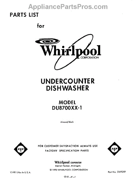 Parts for Whirlpool DU8700XX1: 01 - Front Page Parts