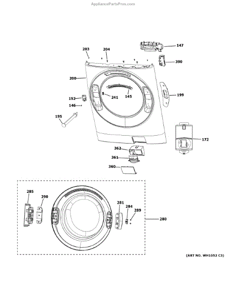 The DOOR ASSEMBLY is an OEM component specifically designed for GE washers. It includes the entire door casing and inner mechanisms that allow for the loading and unloading of laundry. This assembly houses the door lock, gasket, glass, and hardware vital for a secure seal during washing cycles.