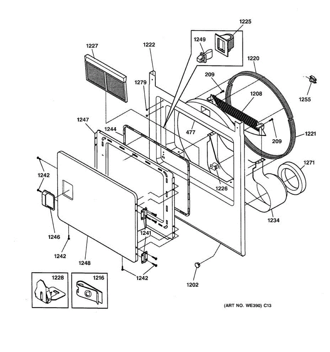 Door hinge for dryers. Attaches the door to the dryer cabinet frame, allowing it to open and close smoothly. Replace if cracked, broken, or worn.