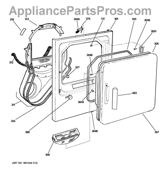 The Handle Door is an OEM part for GE dryers. This door handle allows for easy opening and closing of the dryer door, providing a secure grip to access the drum.