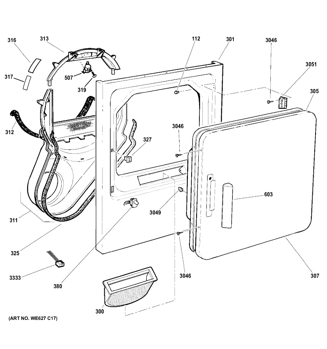 Seals the gap between the drum and front panel to prevent air leaks and noise. Replace if worn, damaged, or causing squeaking sounds. Verify fit with your model.