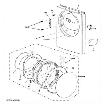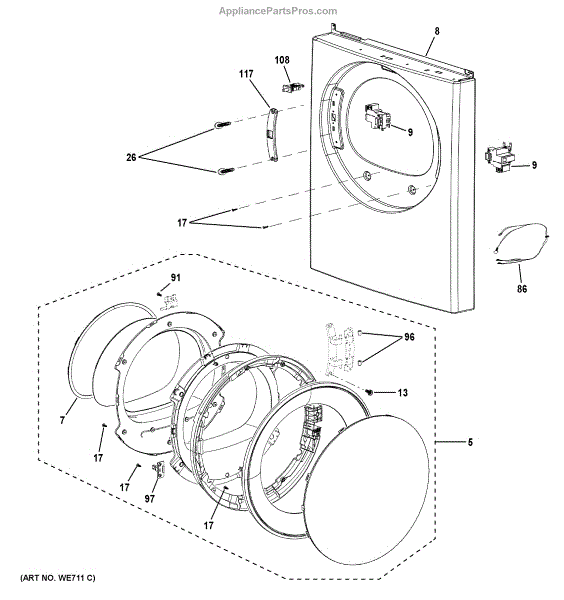 This complete dryer door assembly replaces a damaged, dented or broken dryer front door to restore a secure seal and normal dryer access. It gives the dryer a finished appearance and helps maintain proper drying performance. What it does: