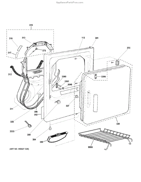 The Door Assembly is an OEM component specifically designed for GE laundry machines. It includes the complete dryer door along with all necessary latching and hinge mechanisms. The door assembly provides a secure sealing entry point for loading and unloading clothes during each cycle.