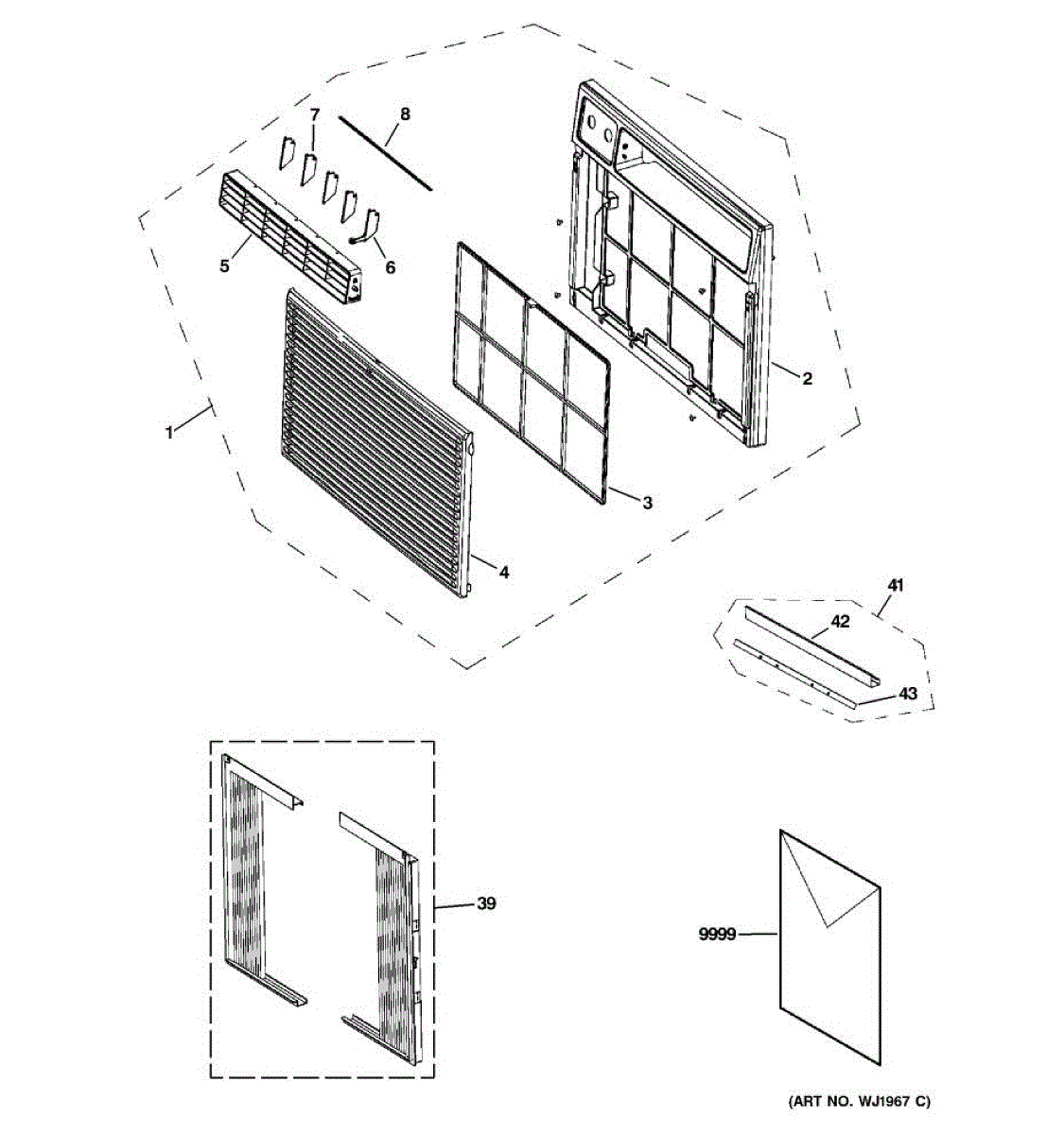 Air filter assembly for room air conditioners. Traps dust and lint to protect the evaporator coil and maintain cooling performance. Verify fit with model.
