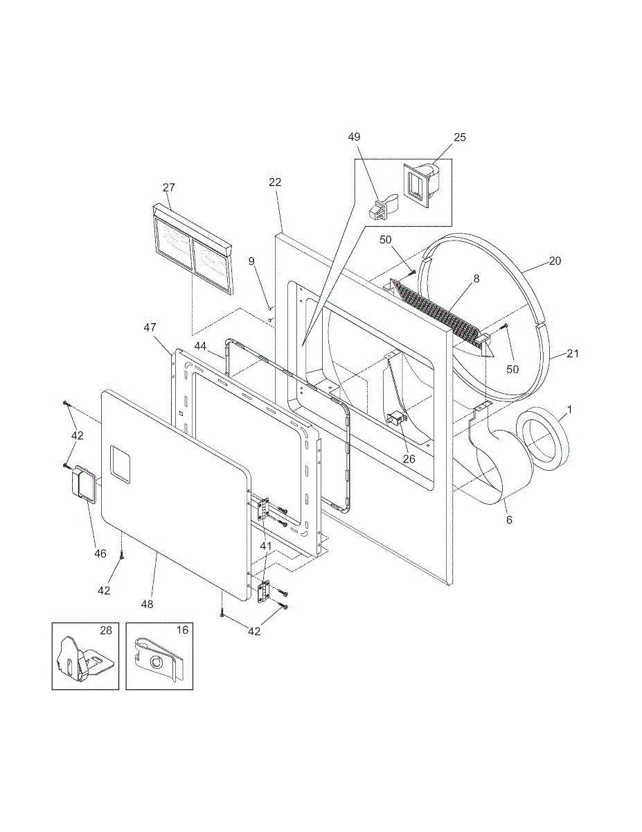Secures the dryer door to the cabinet and provides a smooth pivot point. Replace this hinge if bent, worn, or broken to restore proper door alignment.