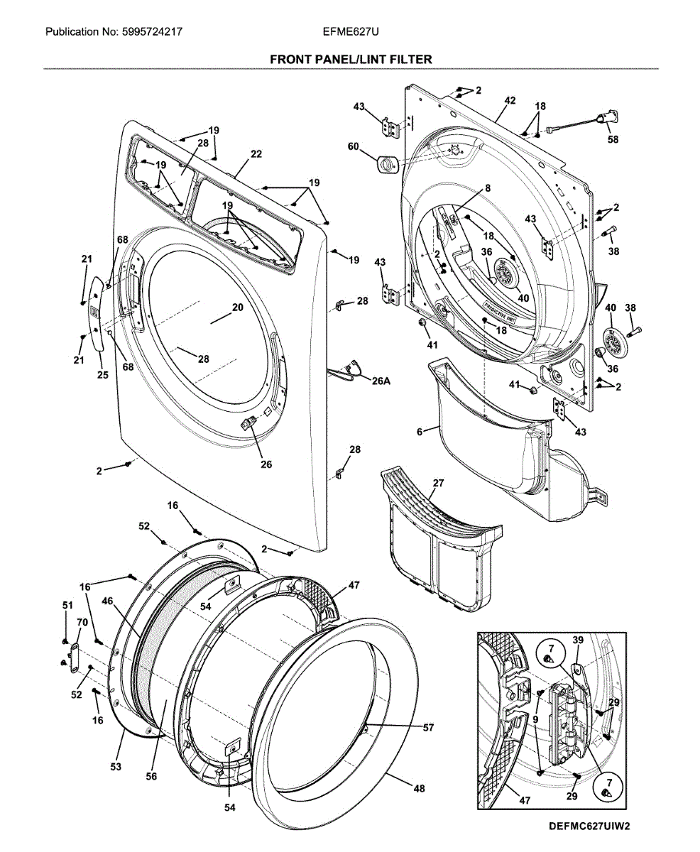 Replace your dryer's inner door assembly if the plastic frame is cracked, warped, or broken. This component mounts to the outer door panel.