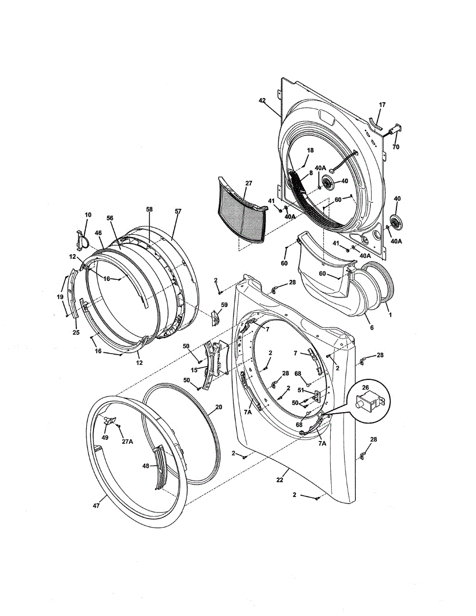 Front bulkhead for dryer drum assembly. Replaces cracked, broken, or worn bulkheads. Essential structural component for proper drum support.