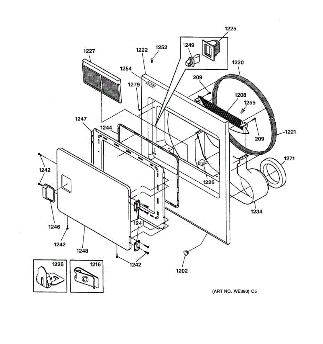 Door hinge for dryers. Attaches the door to the dryer cabinet frame, allowing it to open and close smoothly. Replace if cracked, broken, or worn.